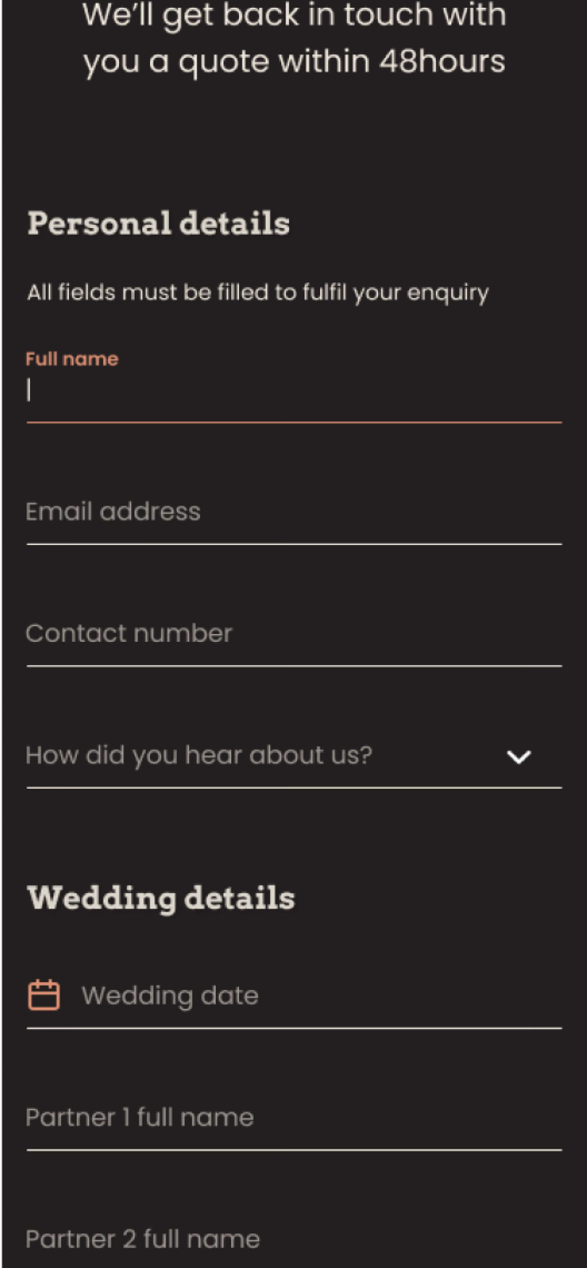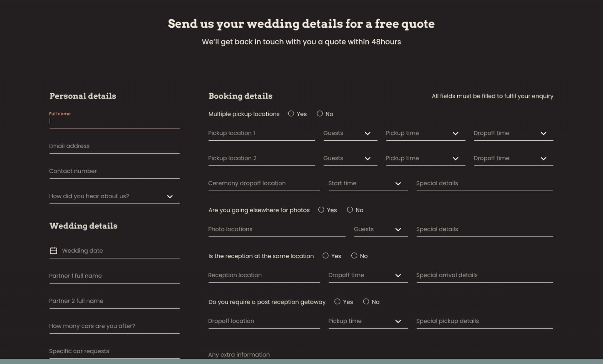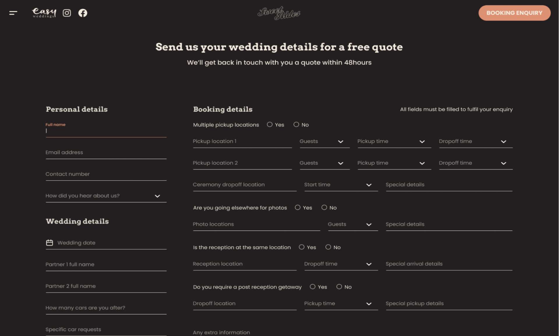 Our aim with Sweet Rides was to help them to stand. When benchmarking against their competitors we noticed how plain and uninspiring other wedding car hire websites are. A key part of this was their desire to cut out the friction between people sending their details and getting a quote by streamlining the quoting process.